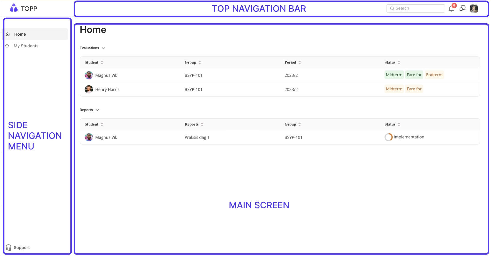 Denna sektion kommer att ge dig en grundlig översikt över funktionerna och funktionaliteterna för handledare tillgängliga i vår TOPP-N webbapplikation. TOPP-N är utformad för att effektivisera dina handledningsuppgifter, främja effektiv kommunikation och ge dig möjlighet att stödja de studenter du tilldelats. Låt oss utforska vad du kommer att hitta på din handledarskärm: