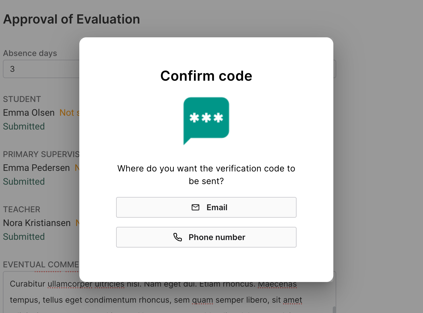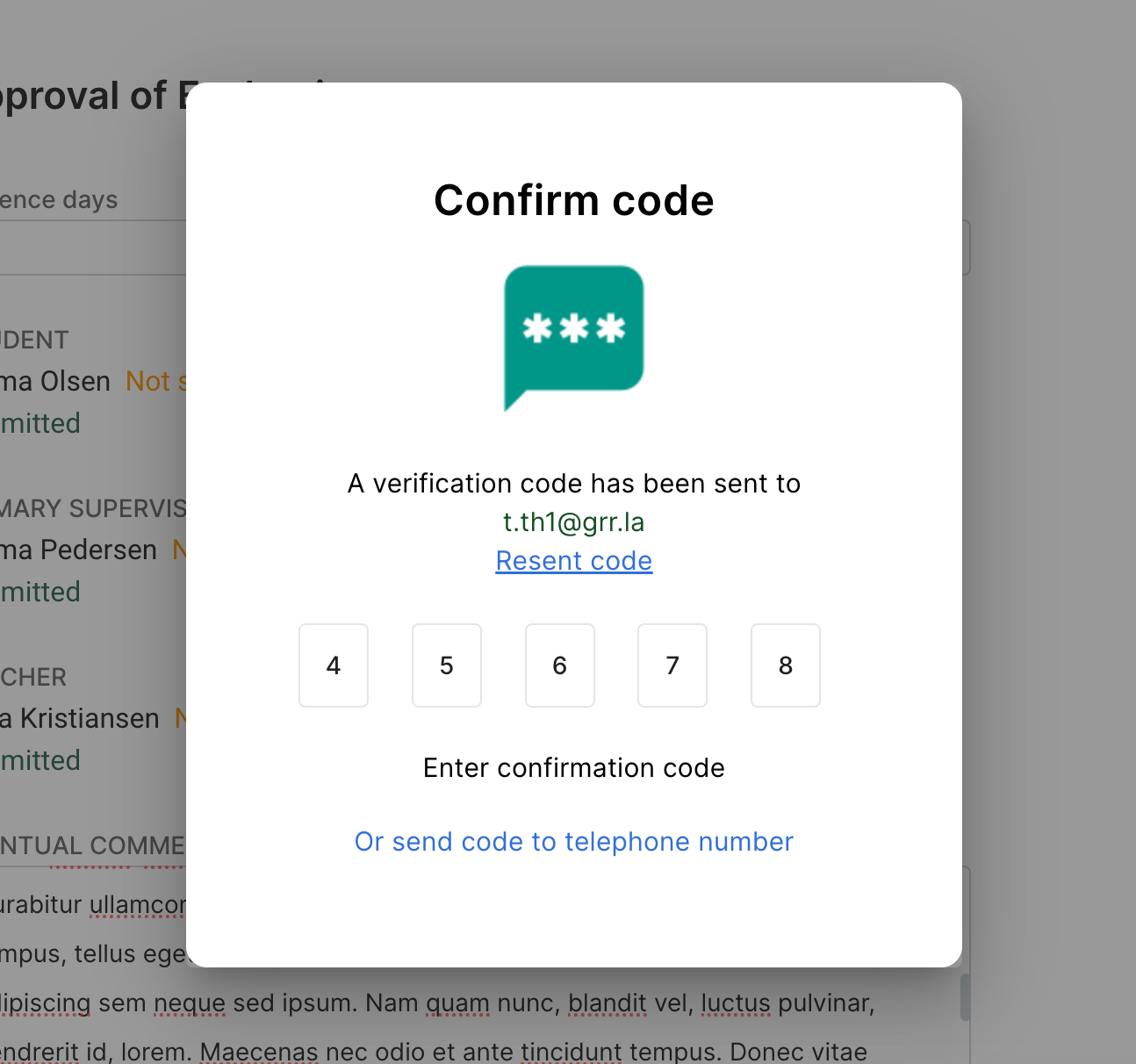 En popup kommer att visas och be dig att ange bekräftelsekoden för din signatur. Denna kod har redan skickats till din registrerade e-post. Om du föredrar att få koden via SMS på din telefon klickar du på knappen 'Eller skicka koden till telefonnummer' i popup-fönstret.
