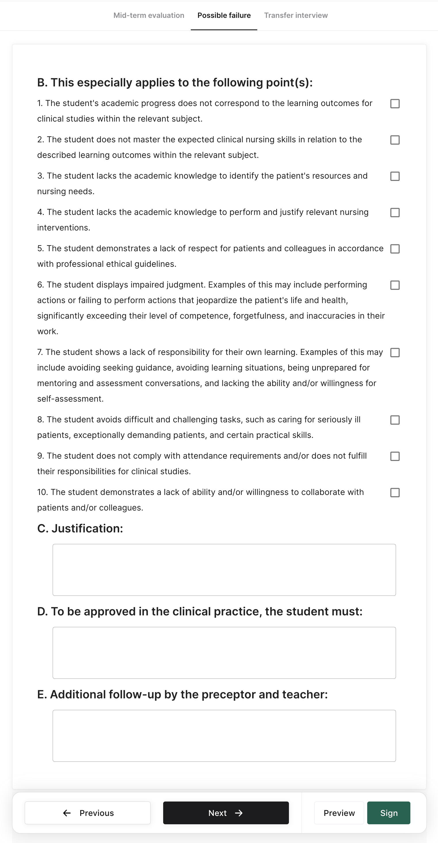 "Risk för icke godkänd praktik"-formuläret kan genereras när som helst, från skapandet av det preliminära bedömningsformuläret till undertecknandet av det slutgiltiga bedömningsformuläret. Som handledare är din roll att visa och underteckna det formulär som skapats av läraren.