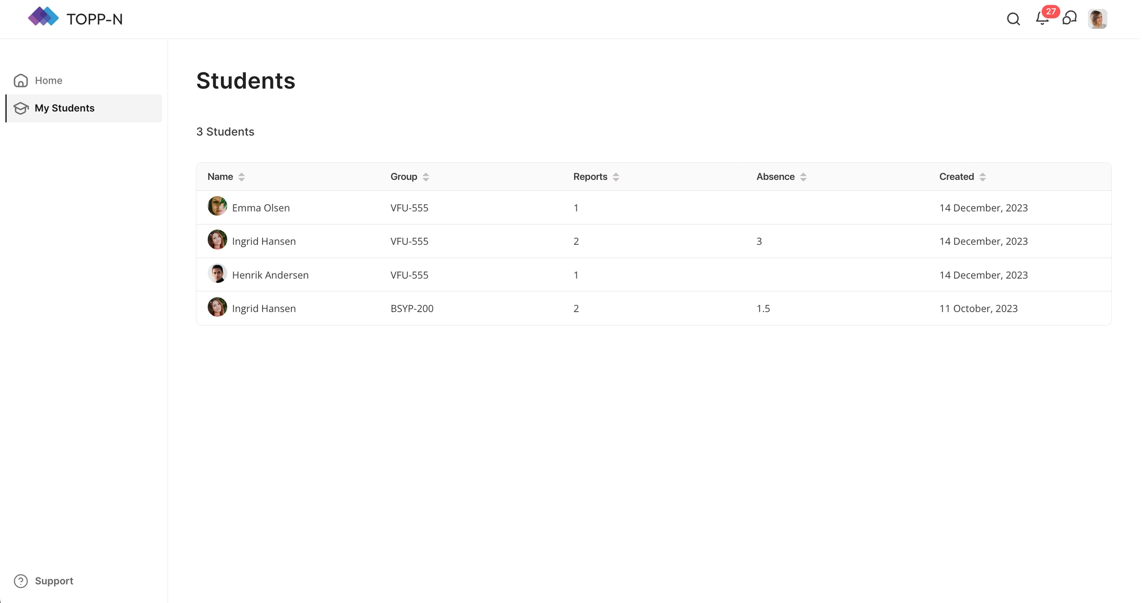 På fliken Mina studenter kan du effektivt hantera och få tillgång till information om alla studenter som är kopplade till dina tilldelade grupper. Här är en översikt över funktionerna: