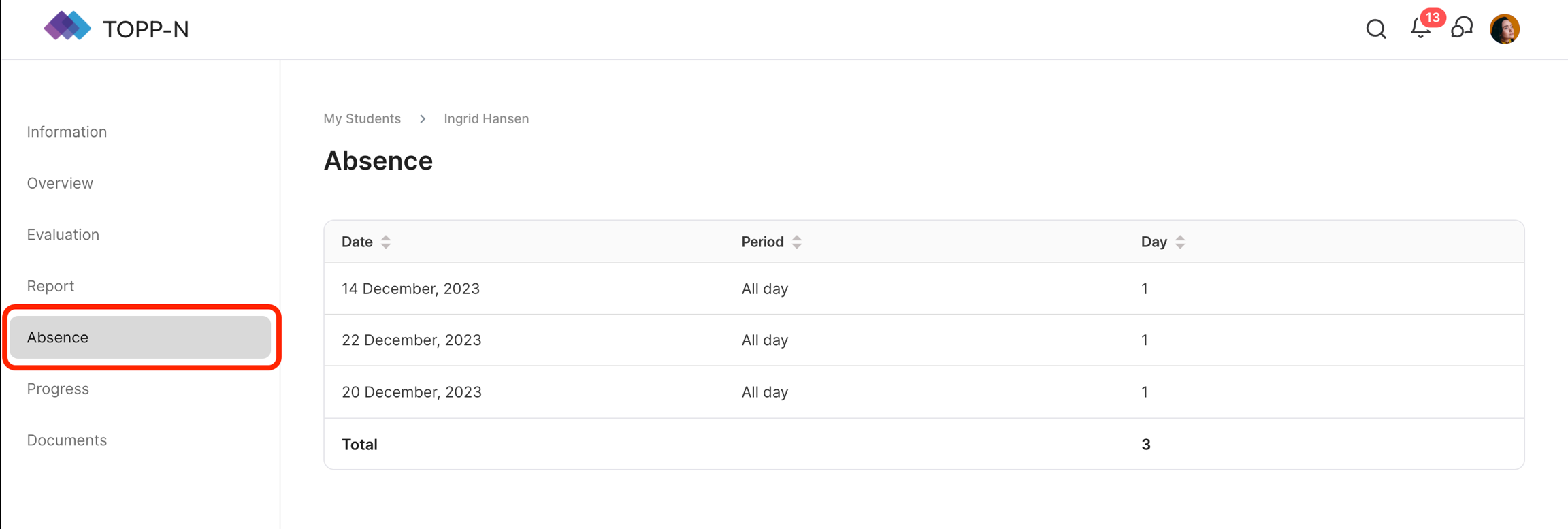 Denna Frånvaro-sektion underlättar effektiv övervakning av en students närvaromönster och hjälper handledare att hålla sig informerade om eventuella perioder av frånvaro och möjliggör proaktiv kommunikation och stöd.