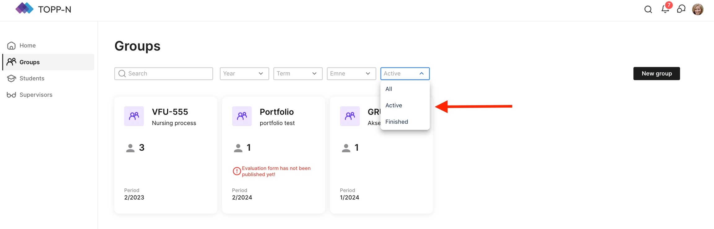 For å forenkle visningen og fokusere enten på aktive eller avsluttede studiegrupper, følg disse enkle trinnene: