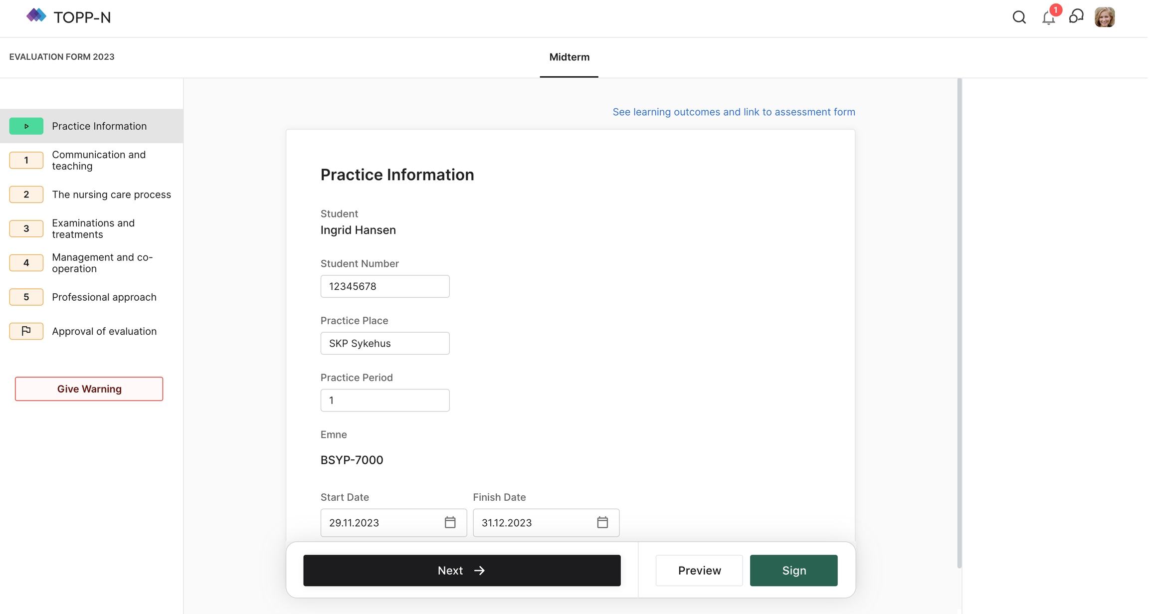Som lärare som granskar utvärderingsrapporten kommer du att stöta på avsnittet "Praktikinformation", som administreras av praktikläraren. Denna sektion innehåller viktiga detaljer om praktiken som du bör gå igenom och fylla i eventuella saknade fält.