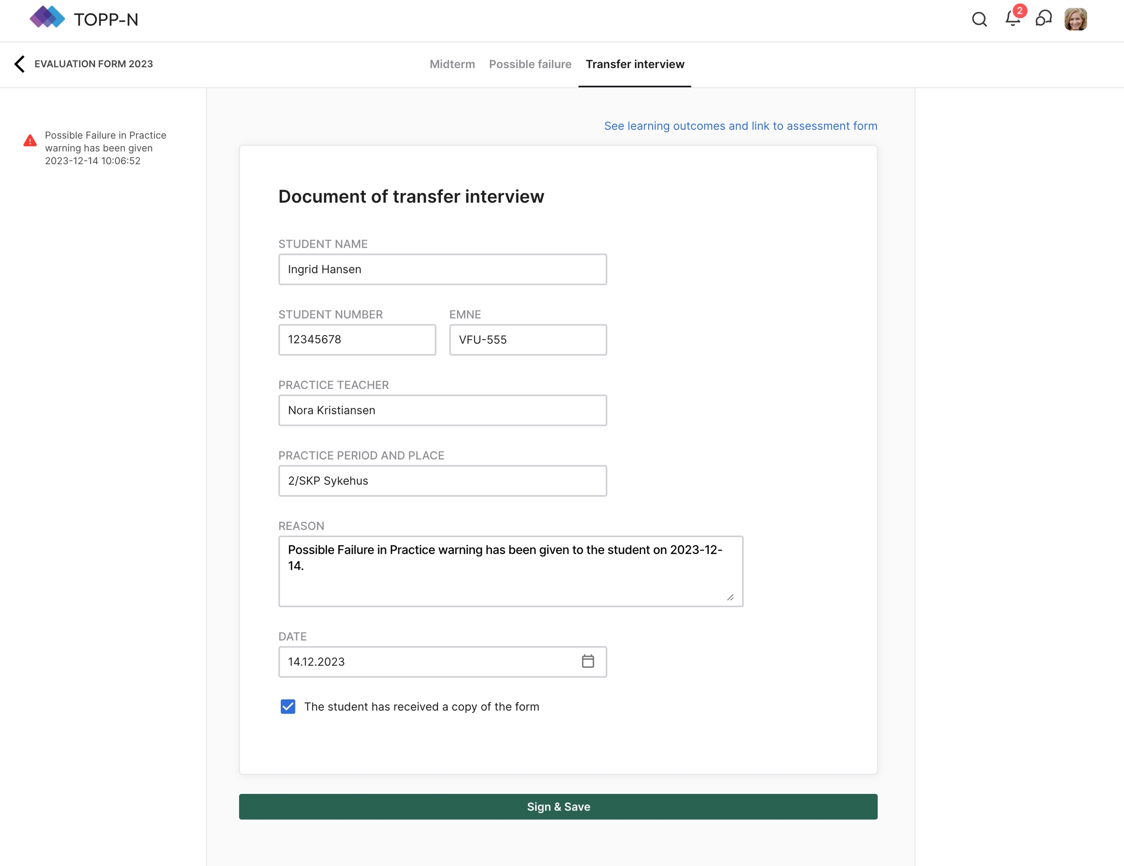 Om ett formulär för eventuell risk för underkännande skapas under mellanvärderingen eller slutvärderingen, genereras överföringssamtalsformuläret automatiskt. Detta säkerställer att eventuella bekymmer angående studentens prestation noggrant tas upp.