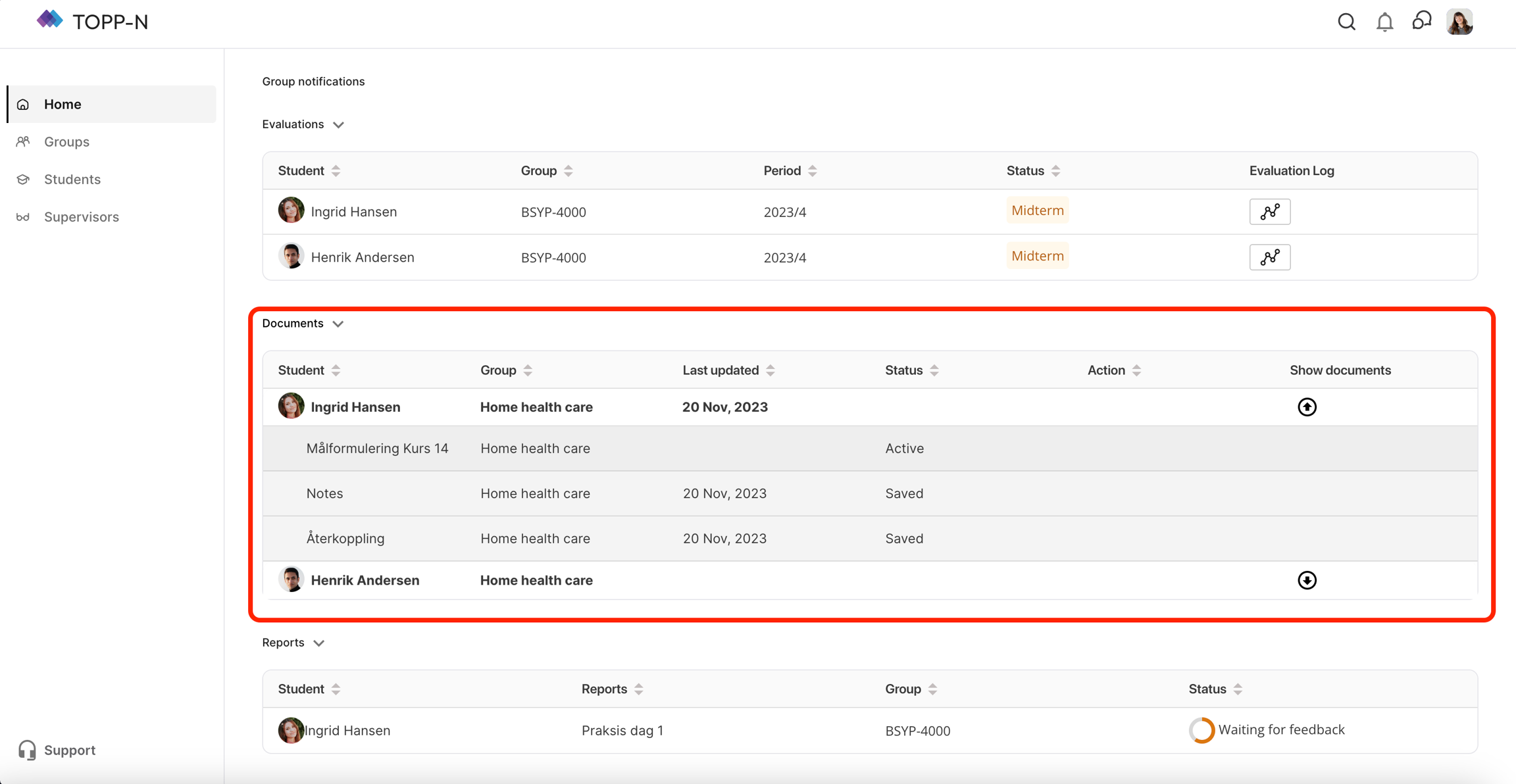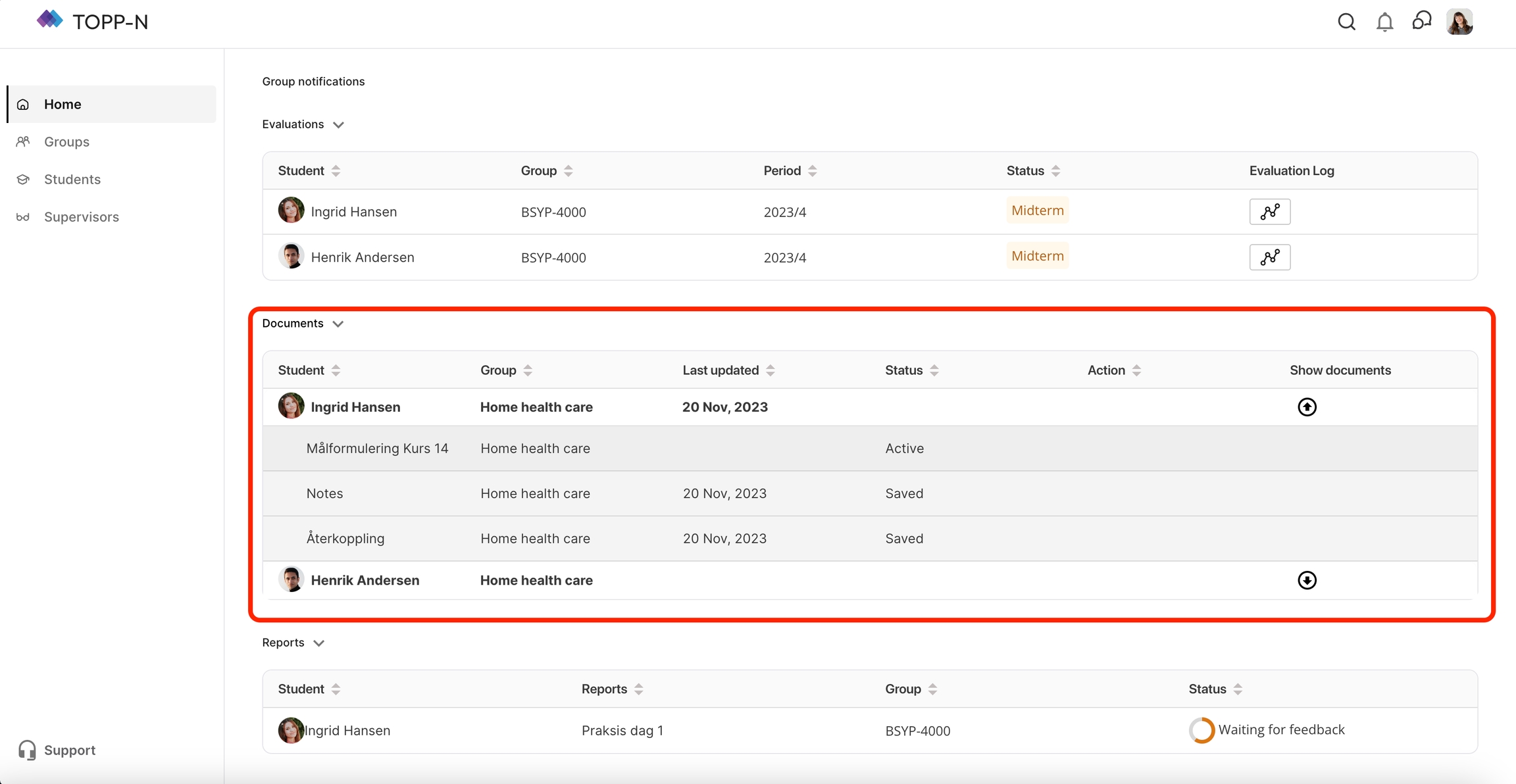 Inom detta avsnitt kan du se en lista över dokument som tilldelats studenter under din tillsyn.