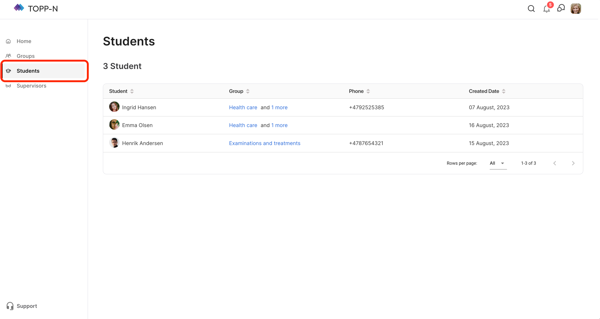 På fanen for elever kan du effektivt håndtere og få tilgang til informasjon om alle elever som er tilknyttet deres tildelte grupper. Her er en gjennomgang av funksjonalitetene: