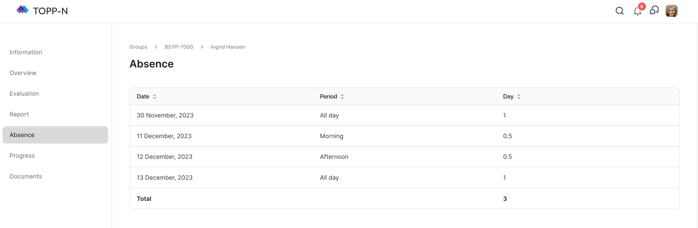 I Fraværsdelen av fanen for elever kan lærere spore og administrere informasjon knyttet til en students nærvær og fravær innenfor den valgte gruppen. Her er hva du kan finne: