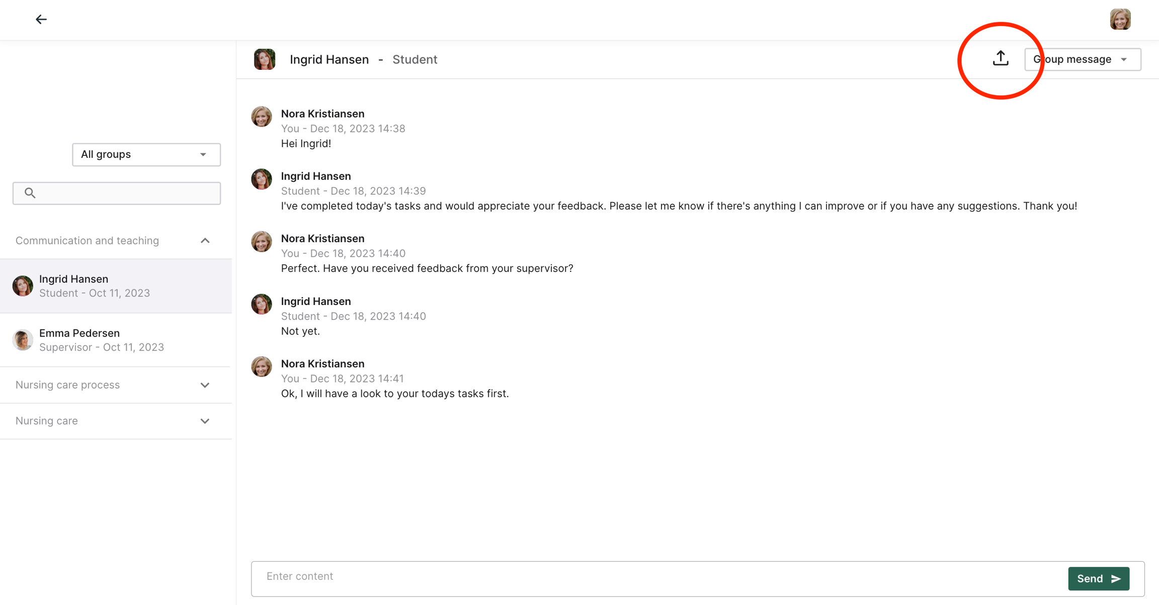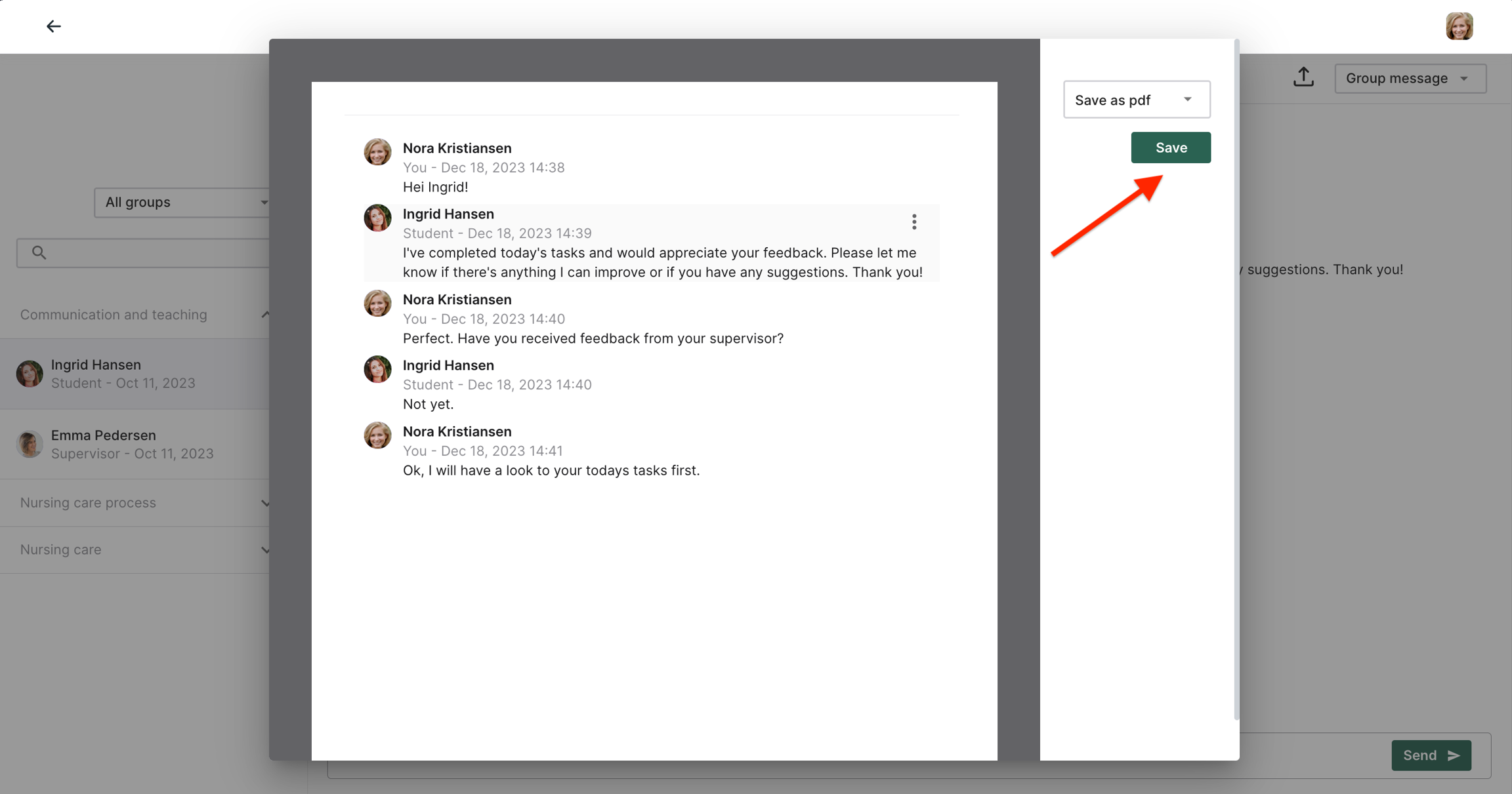 For eksempel: Nora Kristiansen (lærer) kan laste ned samtalen med student Ingrid Hansen i gruppen 'Kommunikasjon og undervisning' ved å klikke på eksportikonet på skjermen.