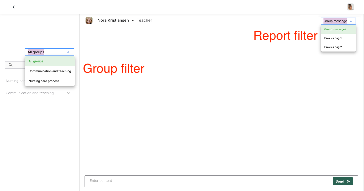 Gruppefiltre: Du kan få tilgang til meldingstjenesten innenfor gruppene dine og samhandle med andre gruppedeltakere som studenter, veiledere og lærere.