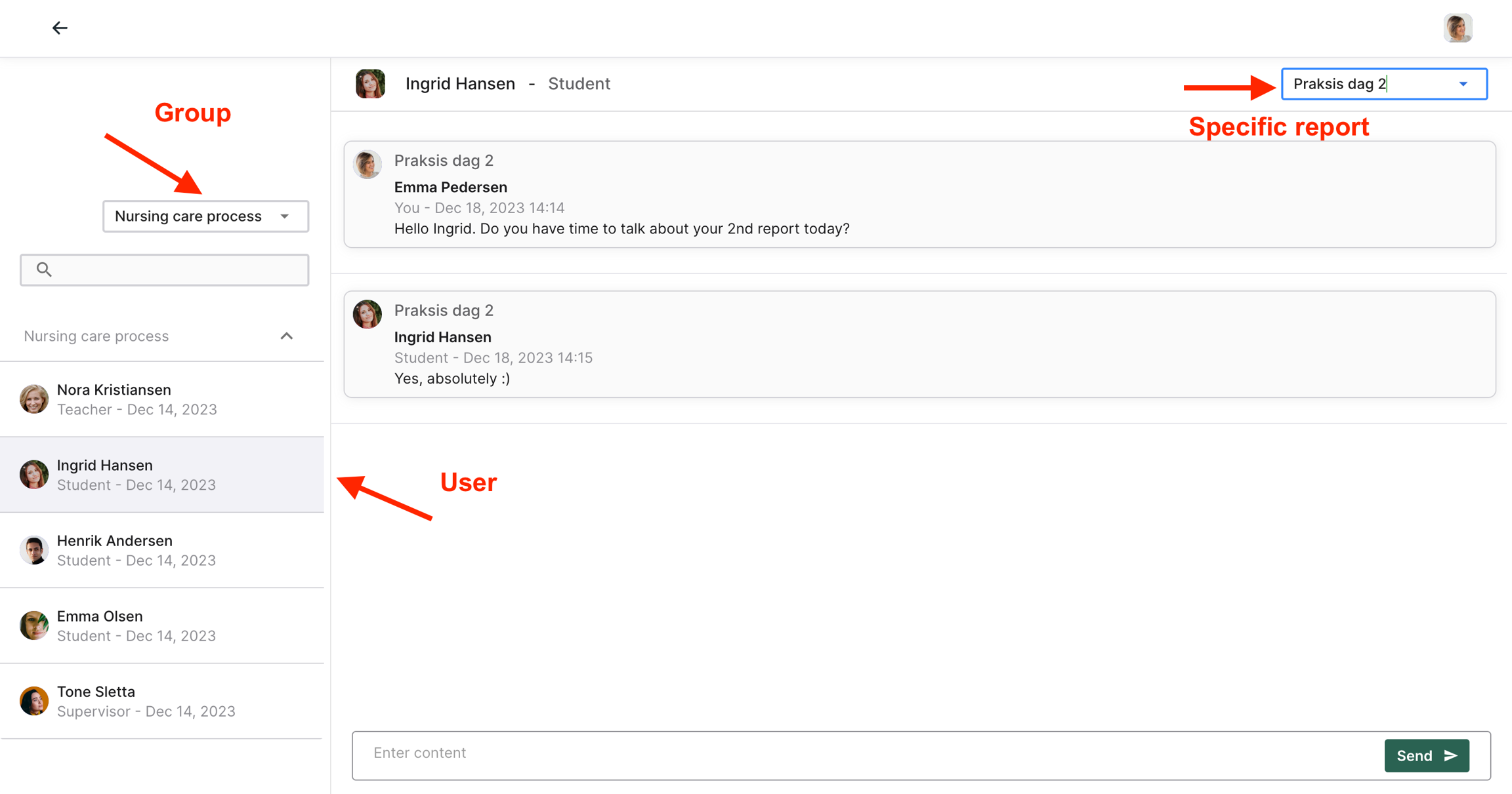 Gruppemeldingsalternativ: Å velge 'Gruppemeldinger'-alternativet fra rapportfilteret er designet for generell kommunikasjon innenfor gruppen, uten behov for å spesifisere en bestemt rapport. Denne funksjonen tillater kommunikasjon med den valgte brukeren uavhengig av daglige rapporter.