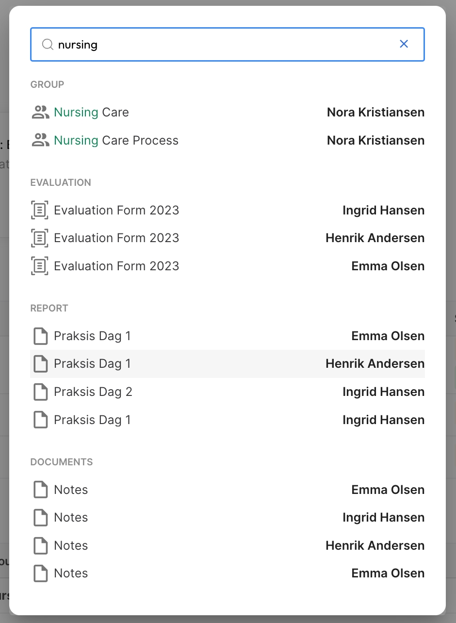 Smart søkeverktøy vil dynamisk skanne gjennom dokumenter, personer, grupper og daglige rapporter.