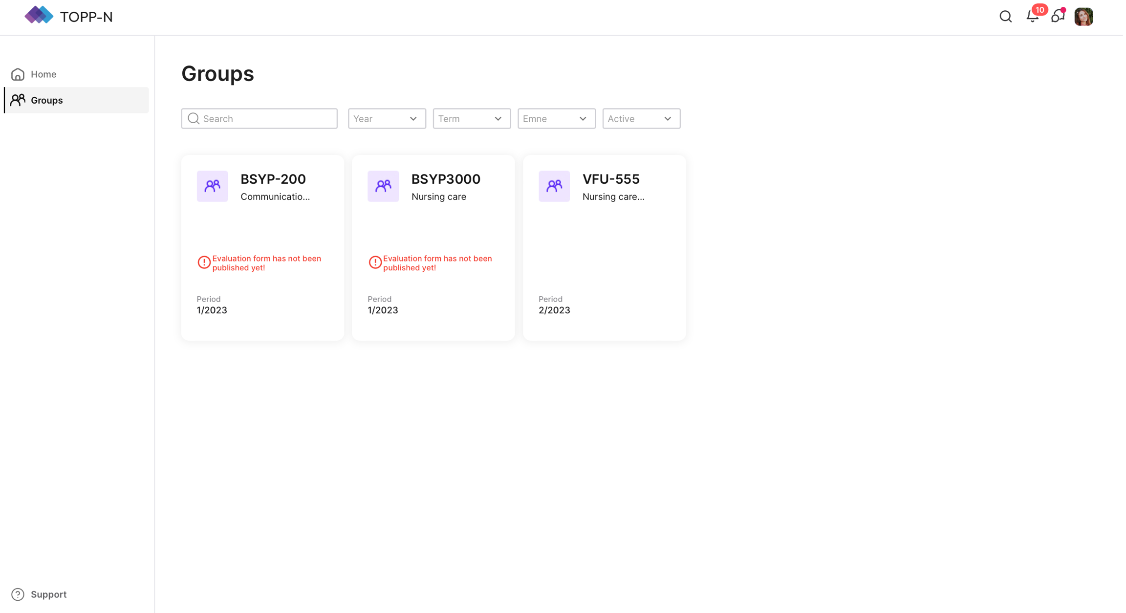 Aktiva grupper: Här hittar du en lista över för närvarande aktiva grupper som du är en del av. Genom att klicka på ett gruppkort får du åtkomst till olika flikar i sidonavigeringsmenyn, inklusive "Gruppinformation", "Gruppdetaljer", "Utvärdering", "Rapport", "Frånvaro" och "Aktivitet" (gruppaktivitetsloggen). Använd dessa flikar för att delta i gruppaktiviteter, få tillgång till viktig gruppinformation, lämna in utvärderingar och rapporter, hantera frånvaro och hålla dig uppdaterad med gruppaktivitetsloggen.