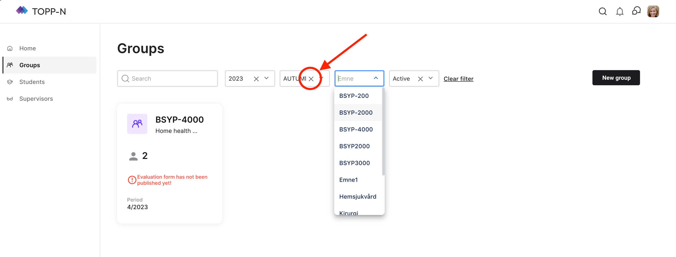 Semesterfilter (Höst/Vår): Välj det passande semesterfiltret för att kategorisera grupper efter terminen, antingen Höst eller Vår.