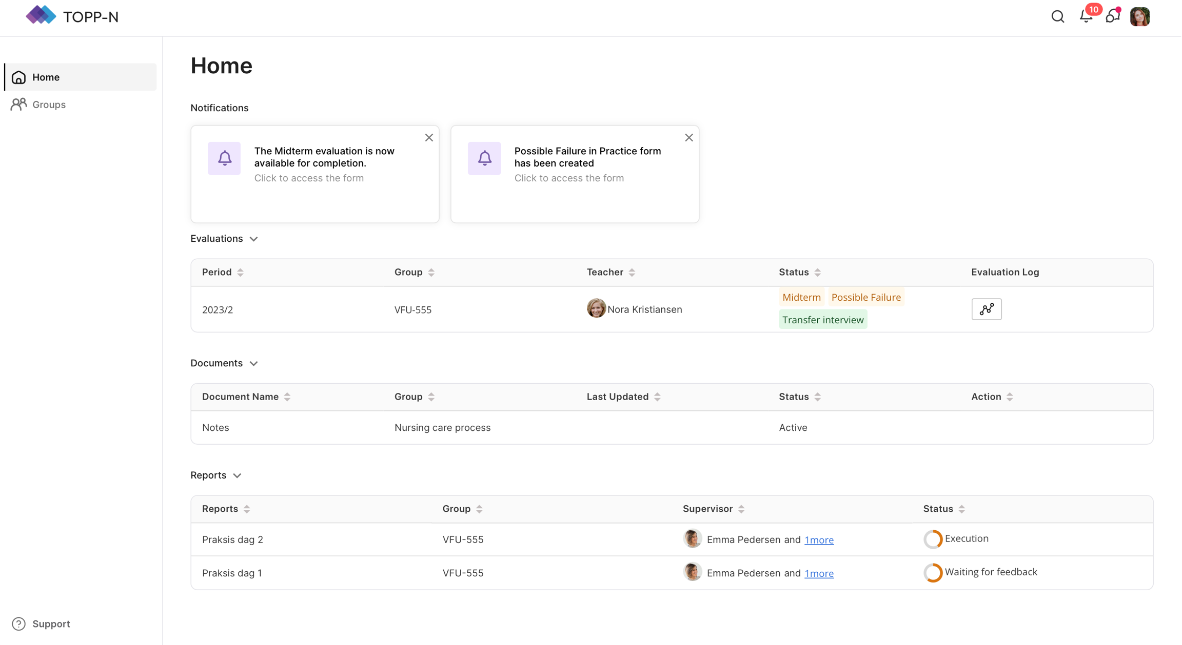 "Hem"-fliken ger dig en personlig översikt över dina aktiviteter och framsteg i TOPP-N.