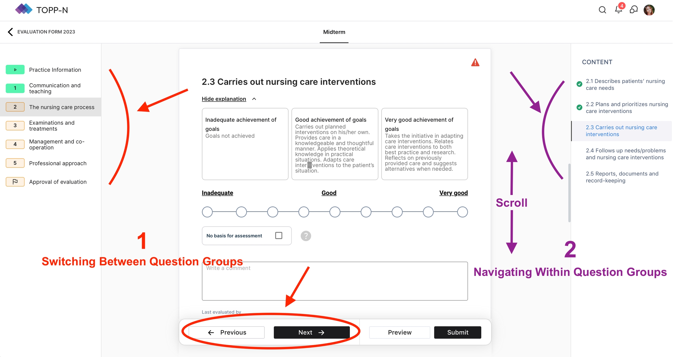 Förflytta dig smidigt genom formuläret genom att trycka på 'Nästa' eller 'Föregående' knapparna längst ner i frågegruppen. Alternativt kan du använda vänstersidemenyn för att växla mellan huvudfrågegrupperna.