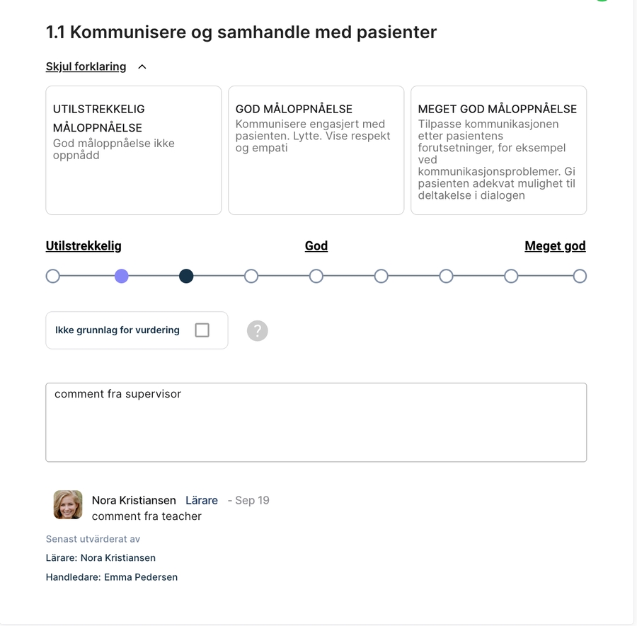 Handledaren kan se studentens bedömning och kommentar.