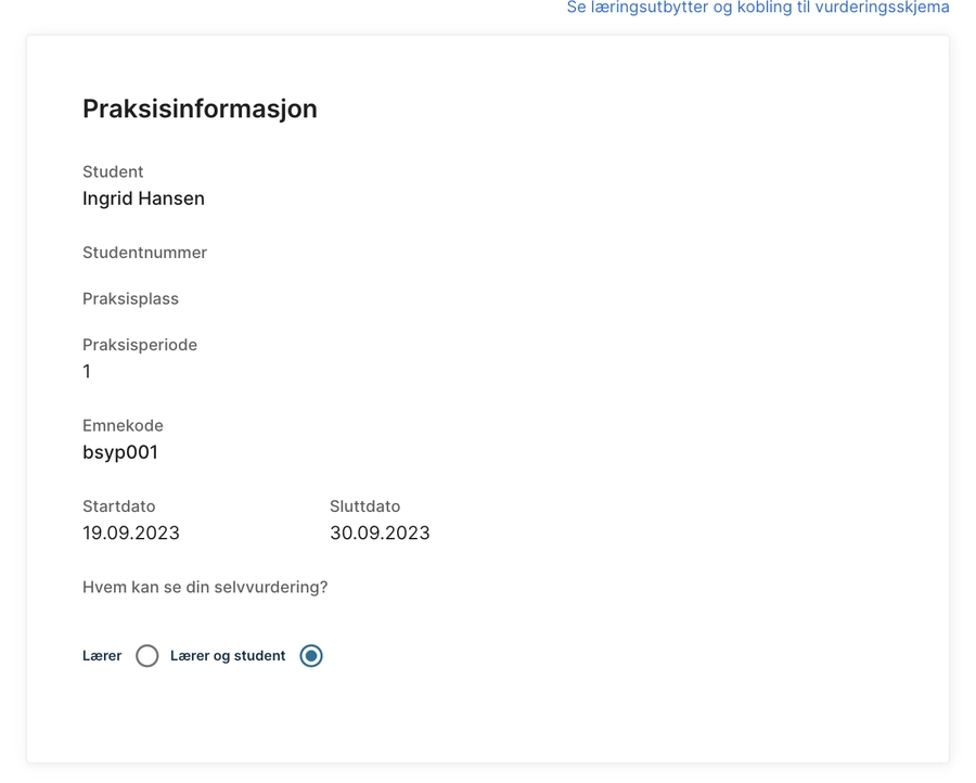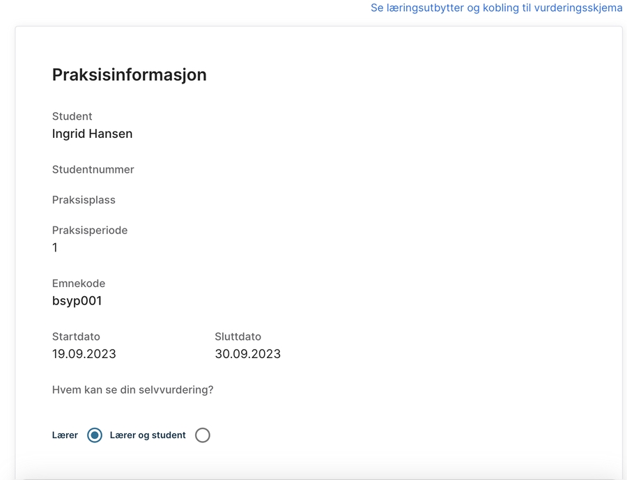 Om denna funktion är aktiverad i din organisation måste du välja om din självvärdering ska vara synlig endast för din lärare eller både för din lärare och handledare.