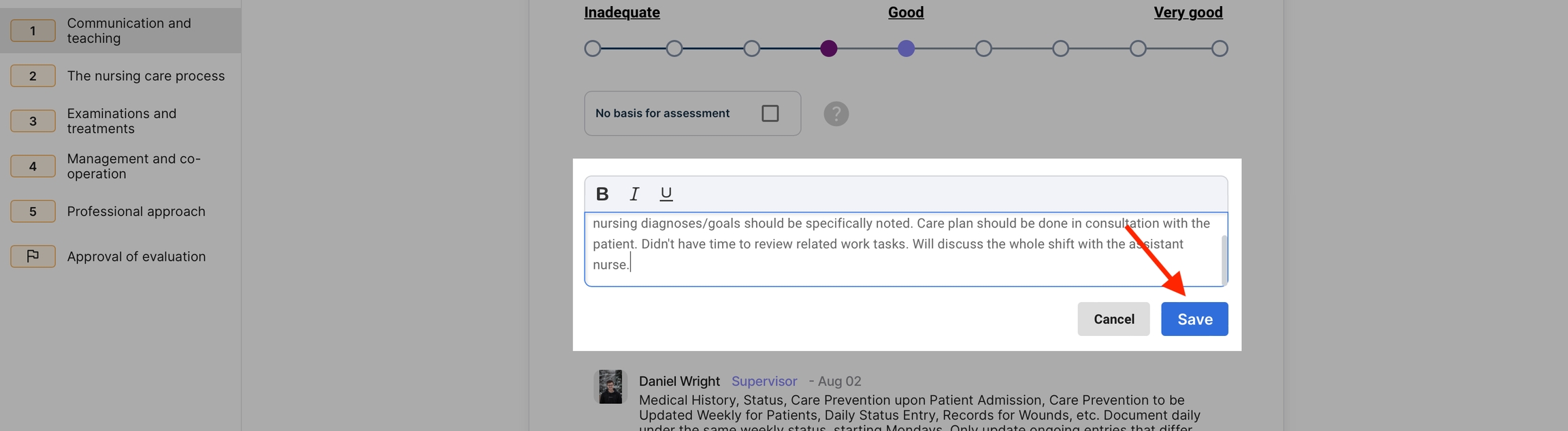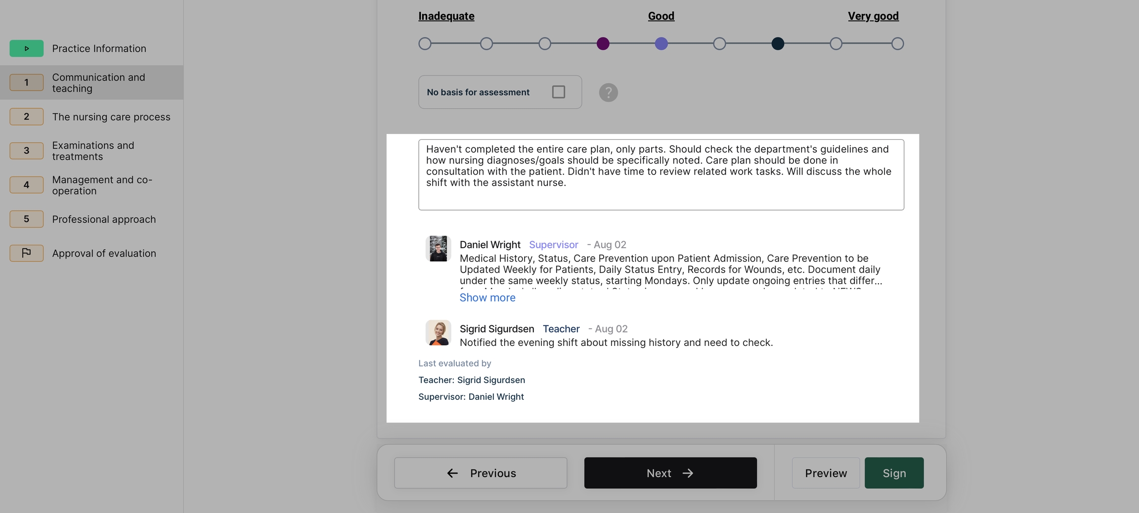 Eftersom flera lärare och handledare kan delta i bedömningsprocessen kan du identifiera den senaste parten som genomförde bedömningen genom att kolla avsnittet "Senast utvärderad av"(Latest evaluated by).