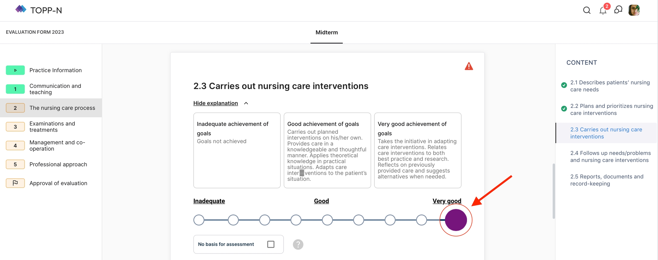 Varje fråga inkluderar en kryssruta (Ingen grund för bedömning) som du kan markera om du anser att självvärderingen för den specifika frågan inte gäller för din situation. Detta kan vara fallet om du inte var involverad i relevanta uppgifter under praktikperioden eller om du känner att ditt engagemang var otillräckligt. Om du markerar denna ruta blir kommentarsfältet obligatoriskt.