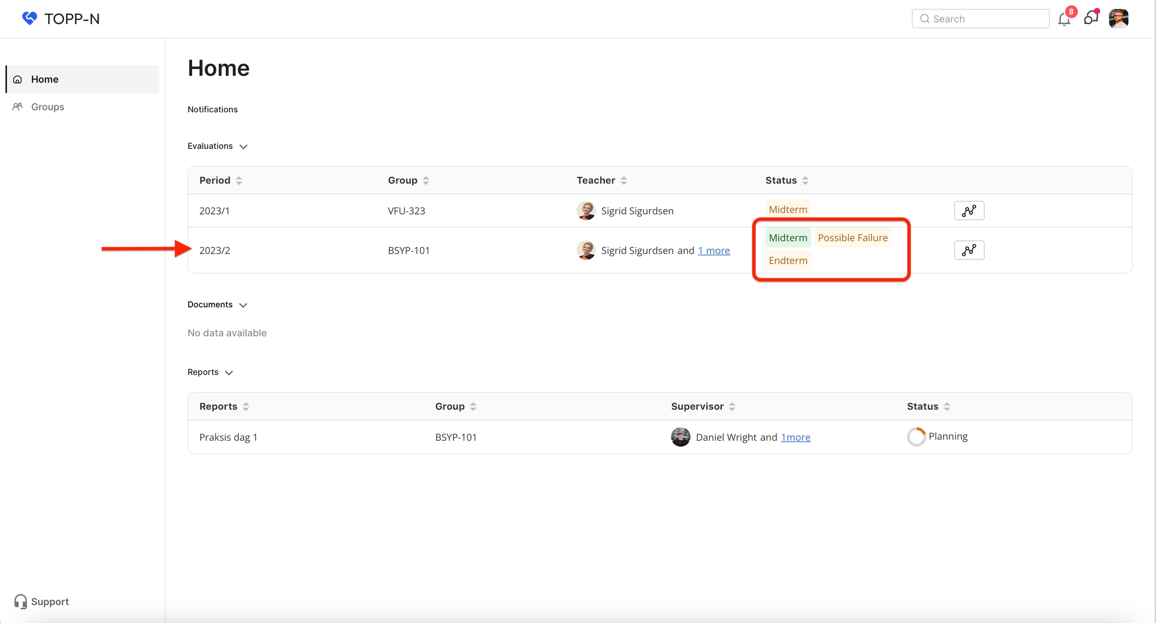 Alternativt, under 'Status,' välj en specifik fas (t.ex. Midtveis, Slutvurdering) för att dirigeras till bedömningssidan.
