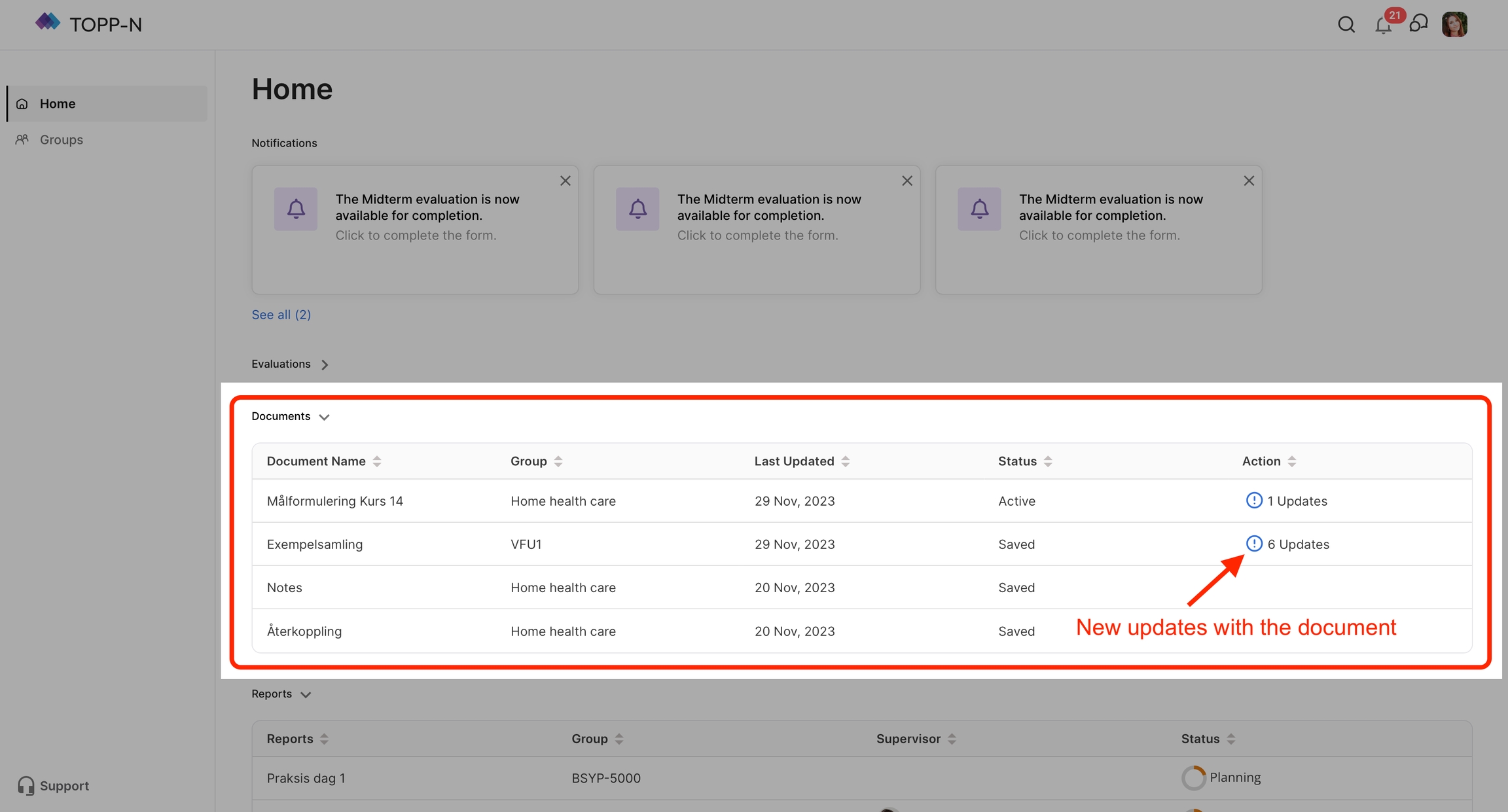 I 'Åtgärd'-kolumnen i dokumentlistan ser du antalet nya uppdateringar kopplade till varje dokument.
