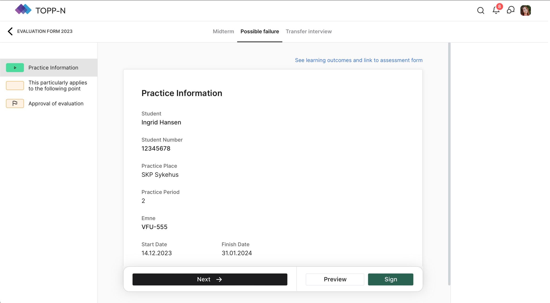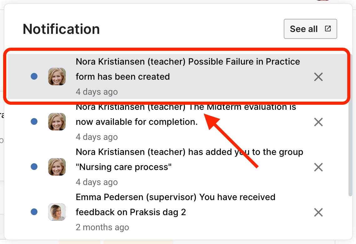 For eksempel vil å klikke på et varsel om en ny Opprettet Mulig Mislykket Praksis-skjema ta deg direkte til det tilsvarende skjemaet for ytterligere handling.