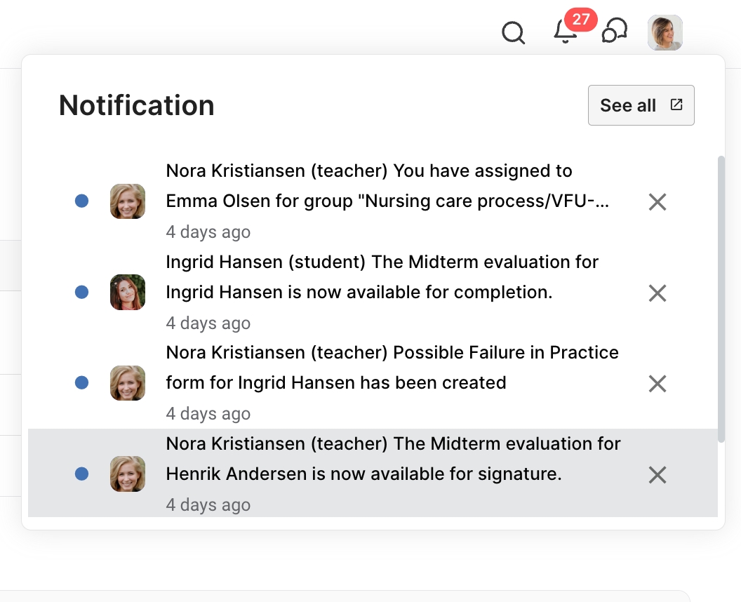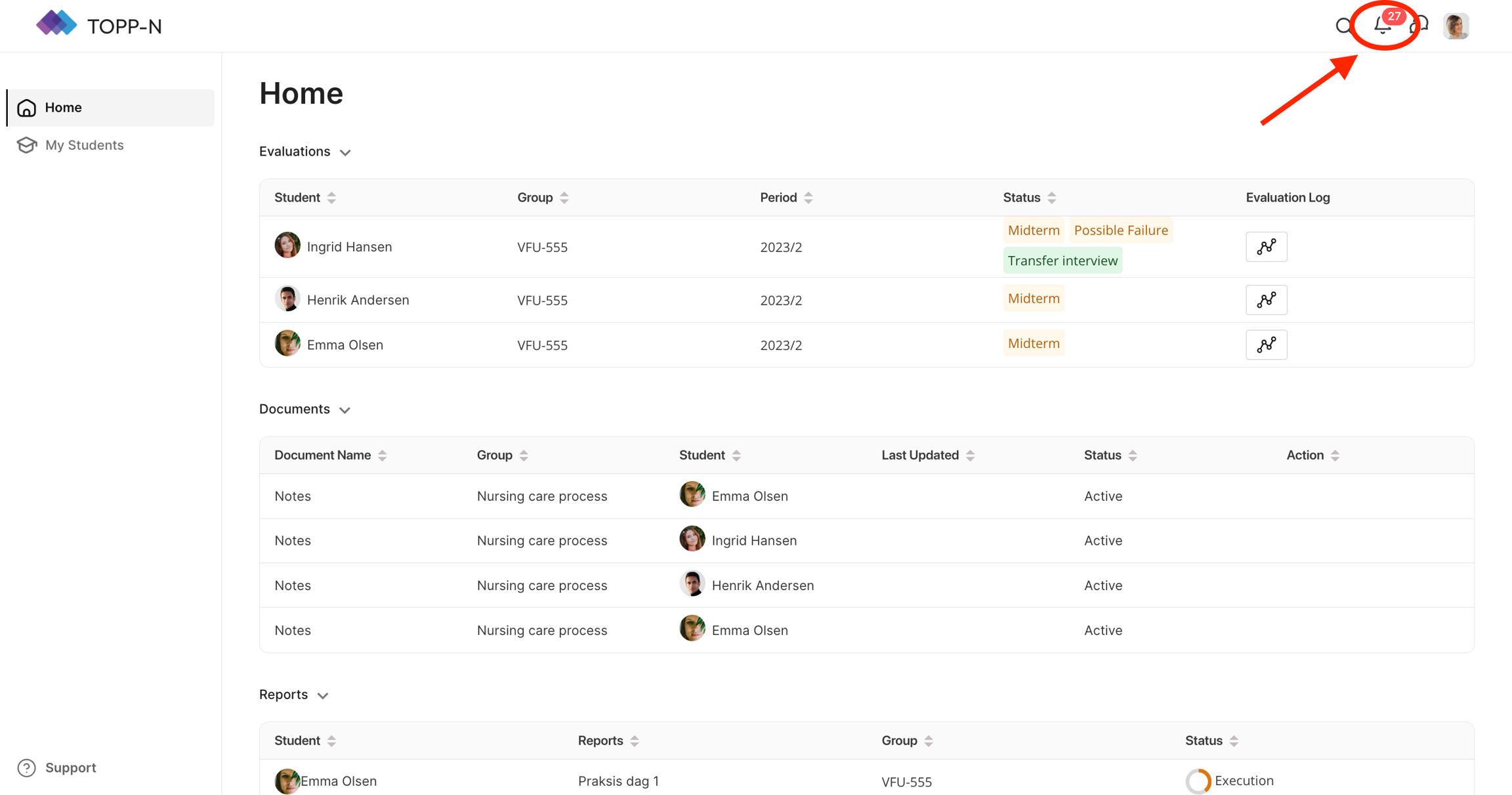 Varsler er en avgjørende komponent på den samarbeidsorienterte plattformen TOPP-N. De er designet for å holde deg informert om ulike aktiviteter innenfor grupper, inkludert tillegg av nye grupper, tildeling av veiledere til studenter, vurderingsrapporter, daglige rapporter og handlinger knyttet til dokumenter. Med varsler kan du effektivt håndtere oppgavene dine, svare på forespørsler og holde deg oppdatert om viktige oppdateringer.